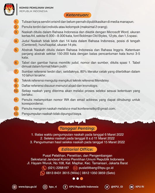 Pengumuman Call For Paper Konferensi Nasional Tata Kelola Pemilu Tahun 2022. Rabu, 02 Maret 2022 00:00 459 Info Lebih Lanjut silahkan Dowload disini 149-Pengumuman Bagikan: Telah dilihat 459 kali