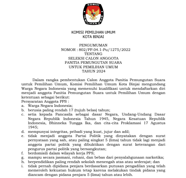 PENGUMUMAN SELEKSI CALON ANGGOTA PANITIA PEMUNGUTAN SUARA UNTUK PEMILIHAN UMUM TAHUN 2024