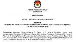 Binjai, kota-binjai.kpu.go.id – Bersama ini diumumkan kepada seluruh masyarakat Kota Binjai Daftar Calon Sementara (DCS) Anggota DPRD Kota Binjai Pemilihan Umum Tahun 2019 (Klik disini). Berdasarkan ketentuan pada keputusan Komisi Pemilihan Umum Nomor961/PL.014-Kpt/06/KPU/VII/2018 tentang Petunjuk Teknis Perbaikan. Penyusunan dan Penetapan Daftar Calon Sementara serta Penyusunan dan Penetapan Daftar Calon Tetap Anggota DPRD, DPRD Provinsi dan DPRD Kabupaten/Kota, menyebutkan bahwa KPU Kabupaten/Kota mengumumkan DCS serta pemenuhan keterwakilan perempuan dalam DCS Anggota DPRD Kabupaten/Kota dan pelaksanaan pakta integritas yang diajukan masing-masing Partai Politik. Sehubugan dengan hal tersebut di atas, Bersama ini diumumkan pemenuhan keterwakilan perempuan dalam DCS Anggota DPRD Kota Binjai serta pelaksanaan pakta integritas masing-masing Partai Politik sebagai berikut : Keterwakilan Perempuan NO PARTAI POLITIK PRESENTASE KETERWAKILAN PEREMPUAN NOMOR URUT NAMA 1 1 Partai Politik Bangsa (PKB) 44 % 2 2 Partai Gerakan Indonesia Raya (Gerindra) 36,6 % 3 3 Partai Demokrasi Indonesia Perjuangan (PDI P) 37,9 % 4 4 Partai Golongan Karya (Golkar) 36,6 % 5 5 Partai NasDem 40 % 6 7 Partai Berkarya 37,9 % 7 8 Partai Keadilan Sejahtera (PKS) 37,9 % 8 9 Partai Persatuan Indonesia (Perindo) 44,4 % 9 10 Partai Persatuan Pembangunan (PPP) 44,8 % 10 11 Partai Solidaritas Indonesia (PSI) 36 % 11 12 Partai Amanat Nasional (PAN) 36,6 % 12 13 Partai Hati Nurani Rakyat (Hanura) 43,3 % 13 14 Partai Demokrat 36,6 % 14 19 Partai Bulan Bintang (PBB) 36 % 15 20 Partai Keadilan dan Persatuan Indonesia (PKPI) 50 % 2. Pelaksanaan Pakta Integritas Dalam Pengajuan Bakal Calon Anggota DPRD Kota Binjai, seluruh Partai Politik sebagaimana tersebut di atas telah melaksanakan pakta integritas yang ditandatangani oleh Ketua/sebutan lain dan Sekretaris/sebutan lain Partai Politik serta cap basah dalam formulir Model B.3. 3. Masukan dan Tanggapan Masyarakat dapat memberikan masukan dan/atau tanggapan terhadap DCS sebagaimana terlampir dengan cara menyampaikan ke Kantor KPU Kota Binjai (Jl. Gatot Subroto N0. 10B atau melalui email: kpukotabinjaiprovsu@gmail.com dengan meyertakan identitas diri yang jelas paling lambat pada 21 Agustus 2018. (redHumasKPUKotaBinjai)