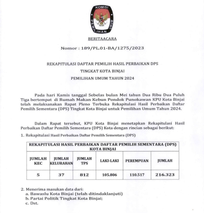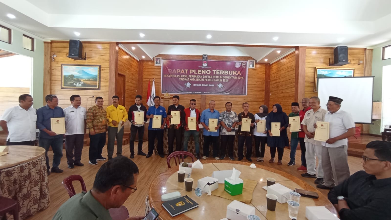 Komisi Pemilihan Umum (KPU) Kota Binjai menggelar rapat pleno terbuka rekapitulasi hasil perbaikan Daftar Pemilih Sementara (DPS) tingkat Kota Binjai untuk Pemilu 2024 mendatang, yang digelar Rumah Makan Kebun Pondol Punokawan, Jalan Gatot Subroto, Kelurahan Limaumungkur, Kecamatan Binjai Barat, Kamis (11/5/2023). Hadir dalam rapat pleno terbuka kali ini, Ketua KPU Binjai beserta seluruh Komisioner, mewakili Wali Kota Binjai Kabankesbangpol Drs Ruslianto MPd, mewakili Dandim 0203/Lkt Danramil 17/BT Kapten Inf Joni Siagian, mewakili Kapolres Binjai Kanit 4 Satintelkam Iptu Madya Putra, mewakili Kalapas Kelas IIA Binjai Kasi Binadik Dat Menda Tarigan, mewakili Kajari Binjai Kasubsi Intel Galuh Eka W SH, Kadis Dukcapil Kota Binjai Wahyudi Hasibuan, Ketua Bawaslu Kota Binjai Syairul Irwan SH MSi, para Kasubag dan anggota KPU Binjai, para Pimpinan Partai Politik/mewakili (18 partai) se-Kota Binjai, serta para PPK se-Kota Binjai. Ketua KPU Kota Binjai Zulfan Effendi, berterima kasih sekaligus mengucap syukur atas terselenggaranya rapat pleno terbuka rekapitulasi hasil perbaikan DPS tingkat Kota Binjai pada Pemilu tahun 2024. “Sebagai Ketua KPU Binjai, saya mengucapkan terimakasih kepada Forkopimda dan para tamu undangan serta ketua Partai Politik atau yang mewakili, yang telah hadir pada acara rapat pleno terbuka rekapitulasi hasil perbaikan daftar pemilih sementara tingkat Kota Binjai ini,” ungkap Zulfan. Berkaitan dengan pelaksanaan kegiatan ini, lanjut Zulfan Effendi, kita melaksanakan rapat kedua terkait DPS Kota Binjai. “Dengan mengucap Basmallah, rapat pleno terbuka rekapitulasi hasil perbaikan daftar pemilih sementara (DPS) Tingkat Kota Binjai Pemilu Tahun 2024, resmi saya nyatakan dibuka,” tuturnya. Sementara itu, Komisioner Kota Binjai yang juga menjabat sebagai Ketua Divisi Perencanaan data dan informasi, Muhammad Arkam, membacakan hasil rekapitulasi perbaikan Daftar Pemilih Sementara (DPS) tingkat Kota Binjai pada Pemilu 2024 mendatang. Hasil rapat pleno terbuka rekapitulasi hasil perbaikan Daftar Pemilih Sementara tingkat Kota Binjai pada Pemilu tahun 2024 di 5 Kecamatan dan 37 Kelurahan dengan 812 TPS untuk DPS Kota Binjai adalah 217.148 orang, dengan hasil perbaikan jumlah DPS adalah 216.323 orang. Hasil perbaikan DPS tingkat Kecamatan se-Kota Binjai untuk Pemilu tahun 2024 yang disampaikan oleh Ketua PPK Kecamatan Binjai Kota dengan 7 Kelurahan TPS 97, jumlah DPS 25.269 orang, perbaikan DPS 25.155 orang. Kecamatan Binjai Selatan dengan 8 Kelurahan , jumlah TPS 16, jumlah DPS 42.978 orang dengan hasil perbaikan DPS 42.821 orang. Kecamatan Binjai Timur dengan 7 Kelurahan, jumlah TPS 176, jumlah DPS , 47.406 orang dan hasil perbaikan DPS, 47.239 orang. Kecamatan Binjai Utara dengan 9 Kelurahan, jumlah TPS 234, jumlah DPS, 62.788 orang dan hasil perbaikan DPS, 62.573 orang. Kecamatan Binjai Barat dengan 6 Kelurahan, jumlah TPS 144, jumlah DPS 38.707 orang serta hasil perbaikan DPS, 38.535 orang. Jumlah keseluruhan DPS Kota Binjai dengan total TPS 812 pada rapat pleno hari Rabu tanggal 5 April 2023 adalah 217.148 orang, jumlah hasil perbaikan DPS Kota Binjai pada rapat pleno terbuka pada Kamis 11 Mei 2023 adalah 216.323 orang dengan jumlah TPS 812. Tanggapan dan masukan dari peserta rapat juga menjadi bagian dalam kegiatan tersebut, serta dilanjutkan dengan penyerahan hasil perbaikan DPS kepada para peserta rapat.