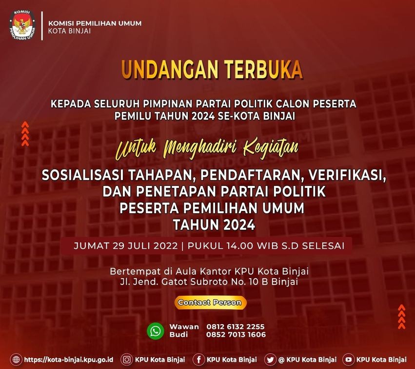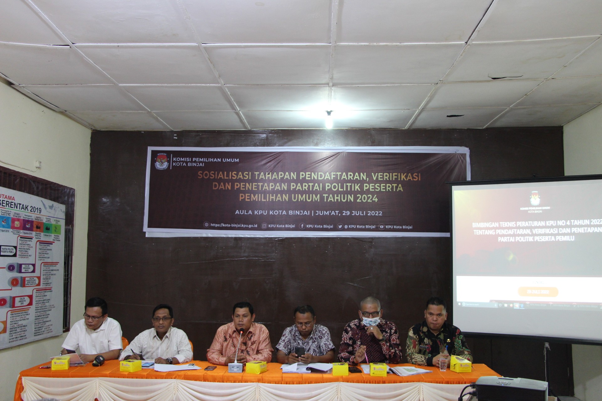 KPU Kota Binjai melaksanakan kegiatan sosialisasi Tahapan Pendaftaran, Verifikasi dan Penetapan Partai Politik peserta Pemilihan Umum Tahun 2024 di aula KPU Kota Binjai, Jumat (29/7/2022).