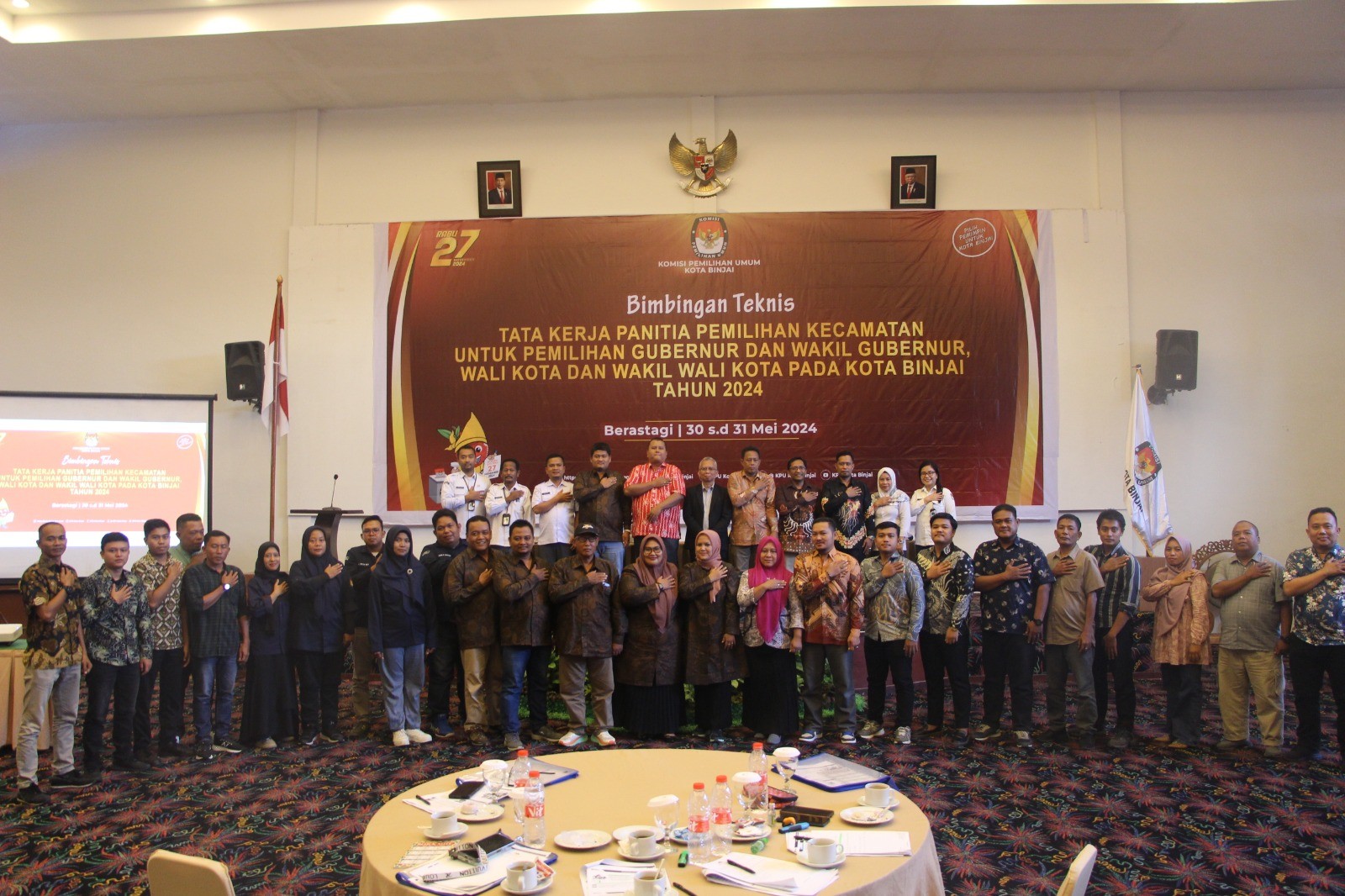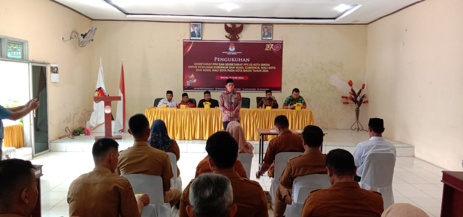 BINJAI, kota-binjai.kpu.go.id - Komisi Pemilihan Umum Kota Binjai melaksanakan Bimbingan Teknis Tata Kerja Panitia Pemungutan Suara (PPS) untuk Pemilihan Gubernur dan Wakil Gubernur Sumatera Utara serta Pemilihan Wali Kota dan Wakil Wali Kota Binjai Tahun 2024, Senin (3/6/2024). Bimbingan Teknis dibuka oleh Ketua KPU Kota Binjai Anton Indratno didampingi 4 Koordinator Divisi Arie Nurwanto, Arifin Saleh, Ahmad Amri Siregar, Hendri Nauli Rambe. Kegiatan ini dihadiri oleh Ketua dan Anggota KPU Kota Binjai, Forkopimda, Bawaslu dan PPP di 37 Kelurahan se-Kota Binjai. Dalam arahannya, Ketua KPU Binjai, Anton Indratno mengatakan, Bimtek merupakan salah satu kegiatan yang wajib dilaksanakan oleh PPS untuk bekal dalam menjalankan tugas sebagai panitia di tingkat kelurahan."Ini sangat penting dilaksanakan, sebab ini menyangkut tentang tugas dan tata kerja PPS di lapangan kususnya di tingkat kelurahan," ujar Anton. Dengan dilaksanakannya Bimtek ini, lanjut Anton, diharapkan dapat mempermudah kerja pihak PPS. "Kan Bimtek ini terkait kerja PPS, jadi ya kita berharap setelah Bimtek ini, PPS dapat mengetahui kerjanya dan mengetahui fungsinya," bebernya. Lebih lanjut Anton menyampaikan agar PPS berperan aktif mensosialisasikan tahapan Pilkada kepada masyarakat. Selain itu, juga mengajak masyarakat untuk menggunakan hak pilih sehingga tidak golput pada hari H pemungutan suara, 27 November 2024 mendatang (Humas KPU Kota Binjai).