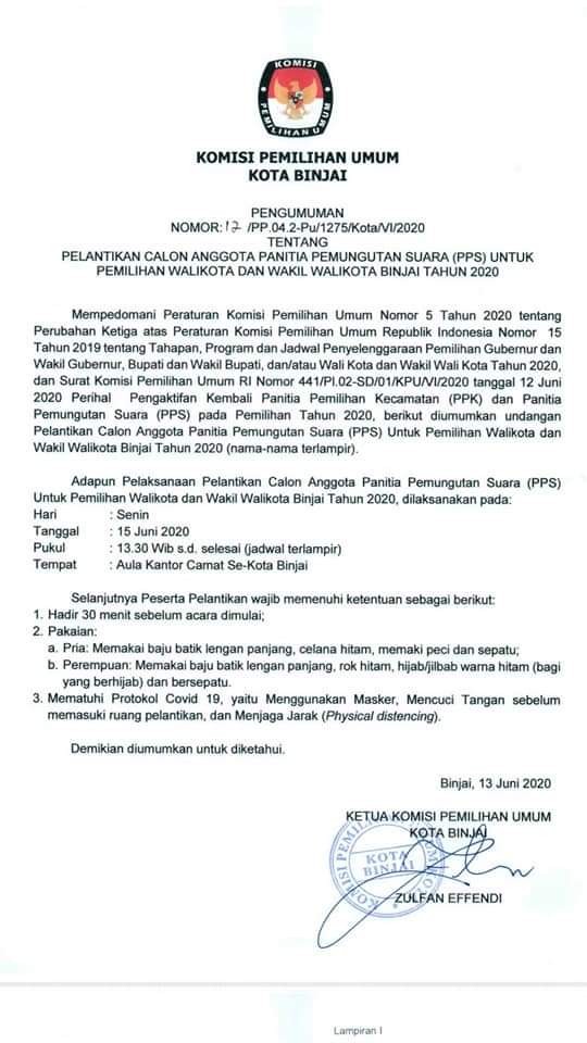 Binjai, kota-binjai.kpu.go.id – Komisi Pemilihan Umum Kota Binjai akan Melaksanakan Tahapan Pelantikan Anggota Panitia Pemungutan Suara (PPS) Se- Kota Binjai, yang akan dilaksanakan pada Hari : Senin Tanggal : 15 Juni 2020 bertempat di Aula Kantor Camat Se-Kota Binjai.