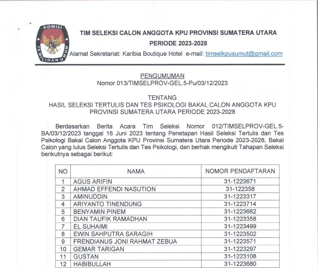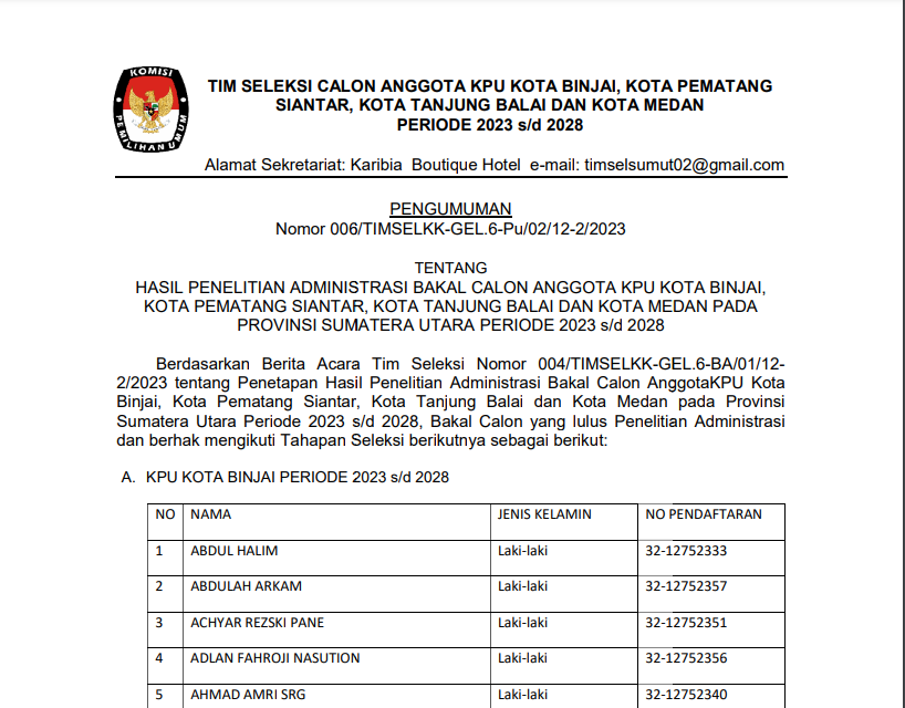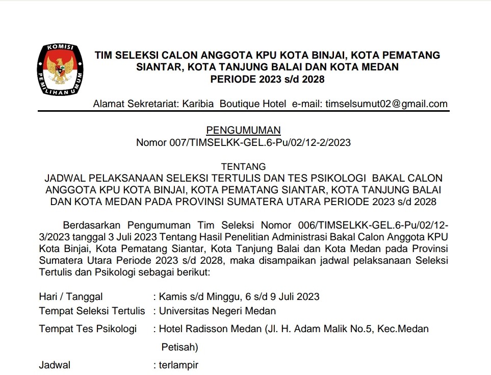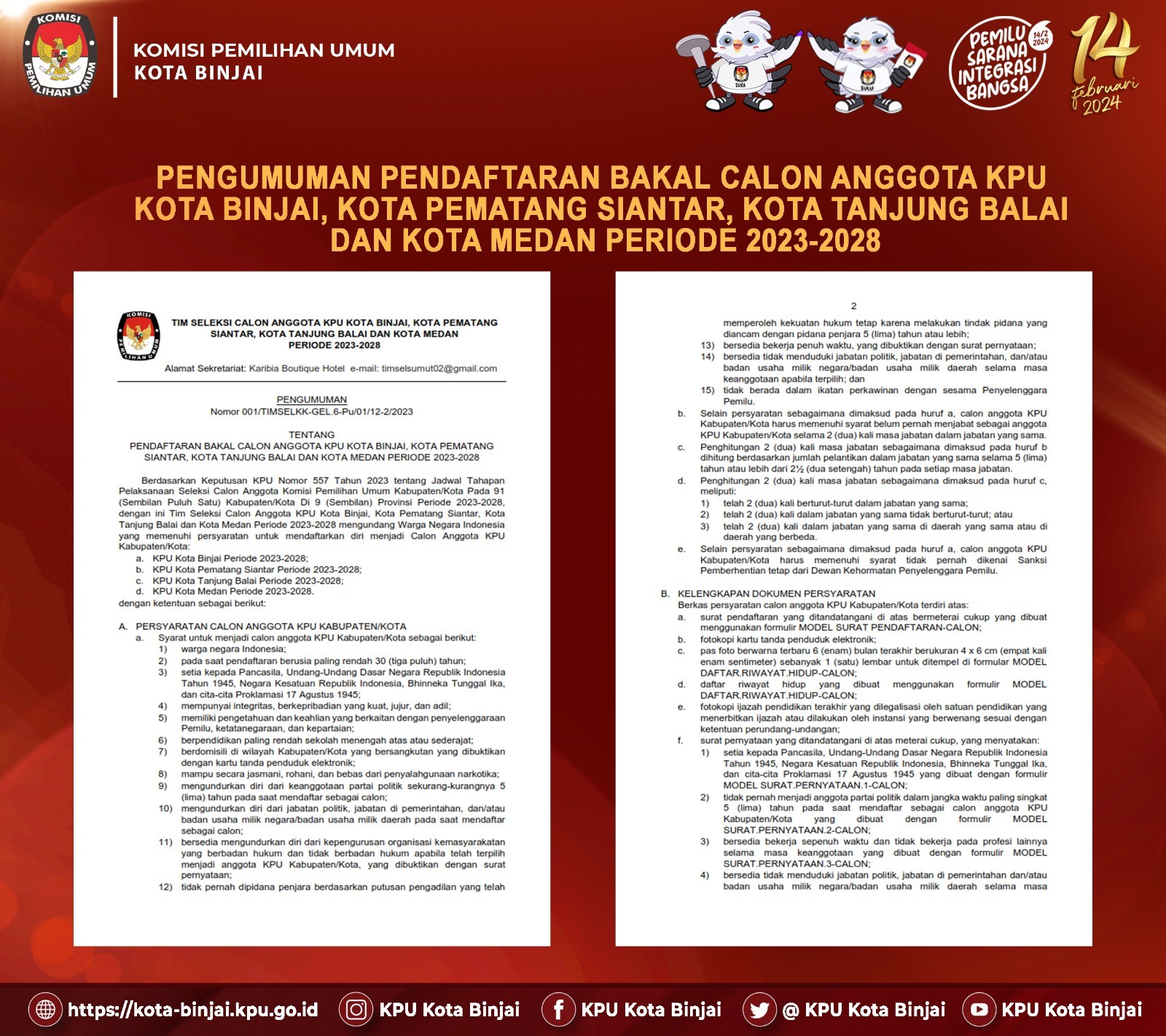 Berdasarkan Keputusan KPU Nomor 557 Tahun 2023 tentang Jadwal Tahapan Pelaksanaan Seleksi Calon Anggota Komisi Pemilihan Umum Kabupaten/Kota Pada 91 (Sembilan Puluh Satu) Kabupaten/Kota Di 9 (Sembilan) Provinsi Periode 2023-2028, dengan ini Tim Seleksi Calon Anggota KPU Kota Binjai, Kota Pematang Siantar, Kota Tanjung Balai dan Kota Medan Periode 2023-2028 mengundang Warga Negara Indonesia yang memenuhi persyaratan untuk mendaftarkan diri menjadi Calon Anggota KPU