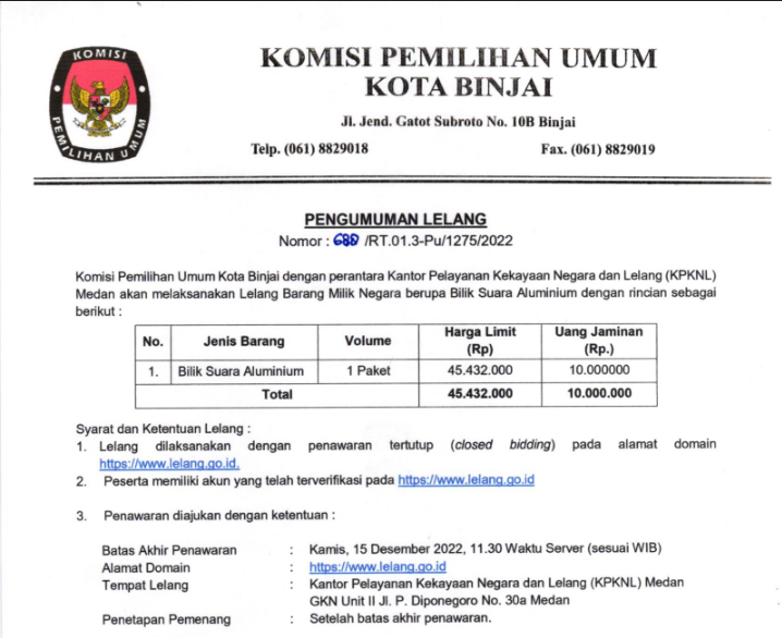 Komisi Pemilihan Umum Kota Binjaidengan perantara Kantor Pelayanan Kekayaan Negara dan Lelang (KPKNL) Medan akan melaksanakan Lelang Barang Milik Negara berupa Bilik Suara Aluminium dengan rincian dapat di DOWNLOAD DISINI.