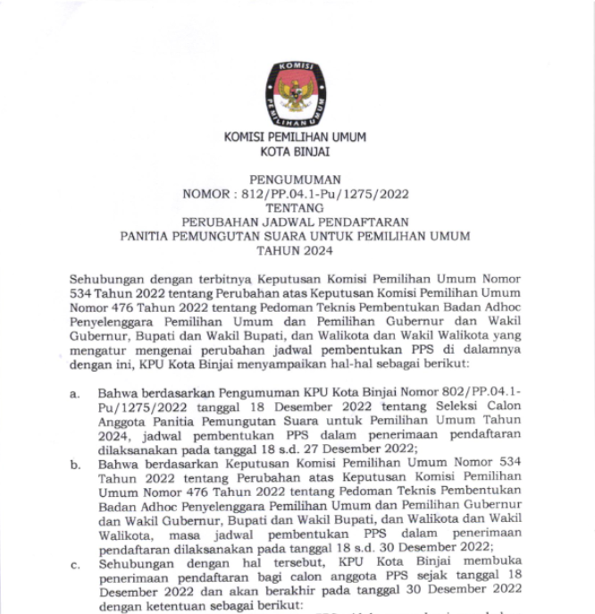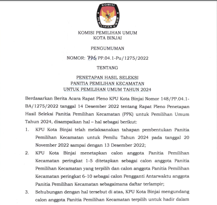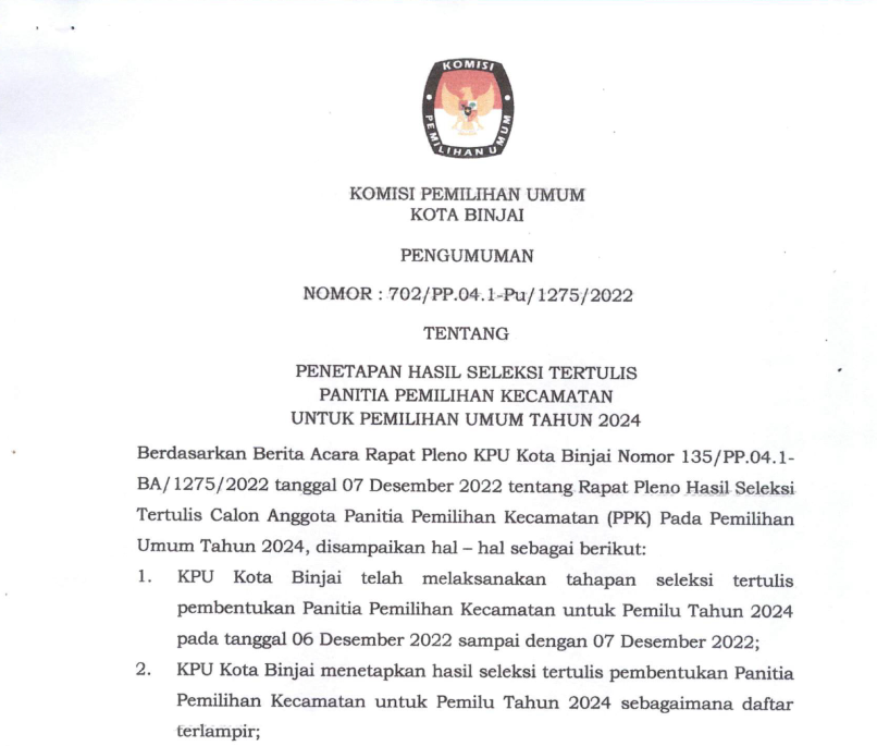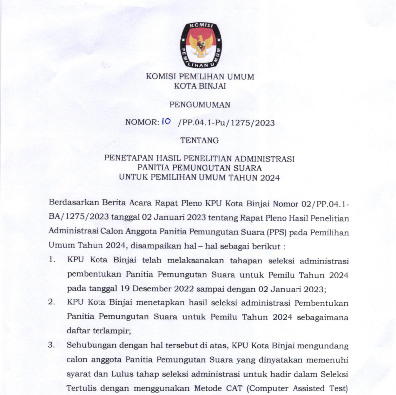 Berikut merupakan Hasil Pengumuman Administrasi Panitai Pemungutan Suara (PPS) untuk Pemilu Tahun 2024