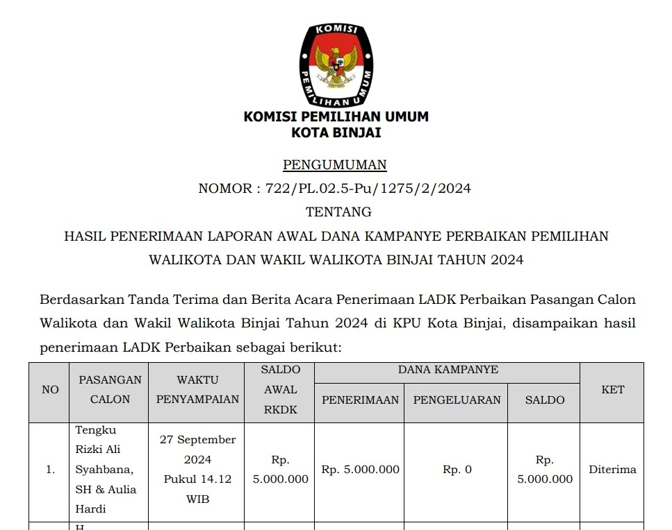 PENGUMUMAN NOMOR : 722/PL.02.5-Pu/1275/2/2024 TENTANG HASIL PENERIMAAN LAPORAN AWAL DANA KAMPANYE PERBAIKAN PEMILIHAN WALIKOTA DAN WAKIL WALIKOTA BINJAI TAHUN 2024