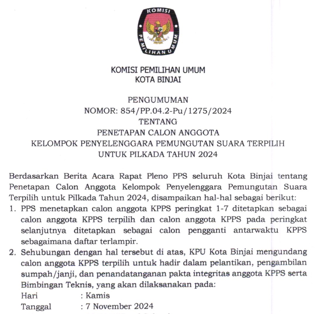PENGUMUMAN NOMOR : 854/PP.04.2-Pu/1275/2024 TENTANG PENETAPAN CALON ANGGOTA KELOMPOK PENYELENGGARA PEMUNGUTAN SUARA TERPILIH UNTUK PILKADA TAHUN 2024.