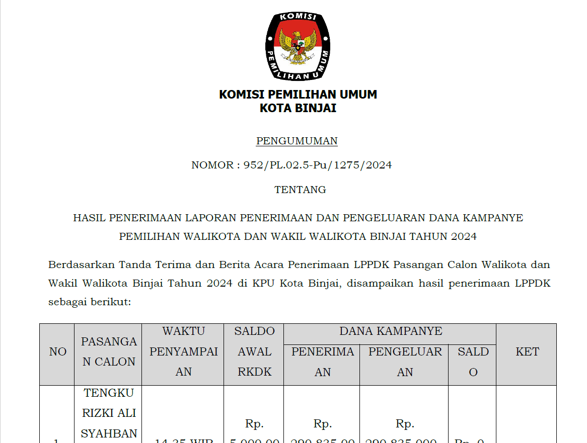 PENGUMUMAN NOMOR : 952/PL.02.5-Pu/1275/2024 TENTANG HASIL PENERIMAAN LAPORAN PENERIMAAN DAN PENGELUARAN DANA KAMPANYE PEMILIHAN WALIKOTA DAN WAKIL WALIKOTA BINJAI TAHUN 2024.