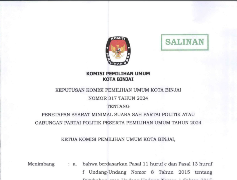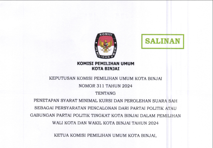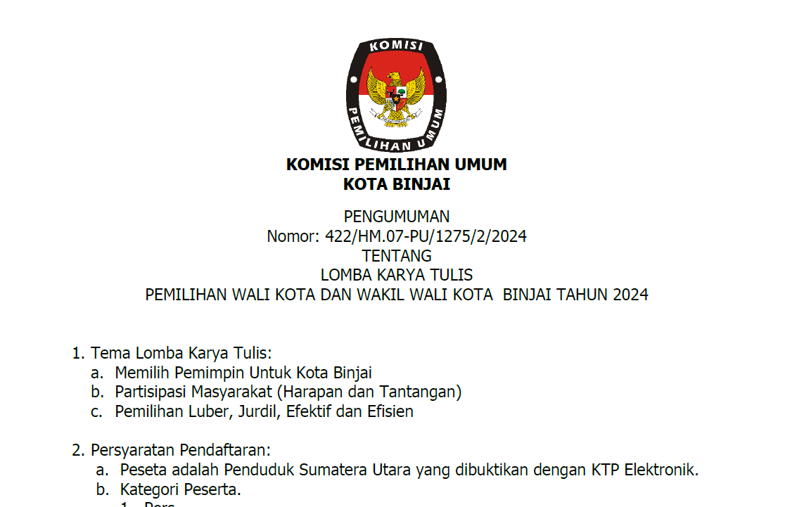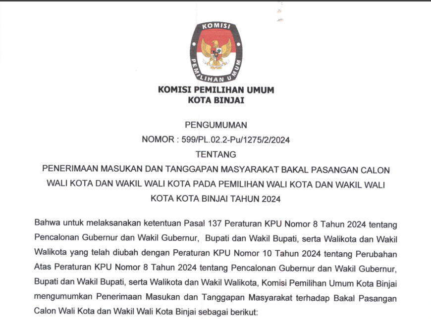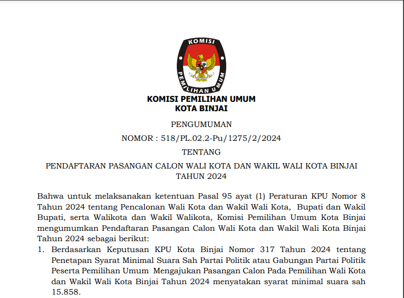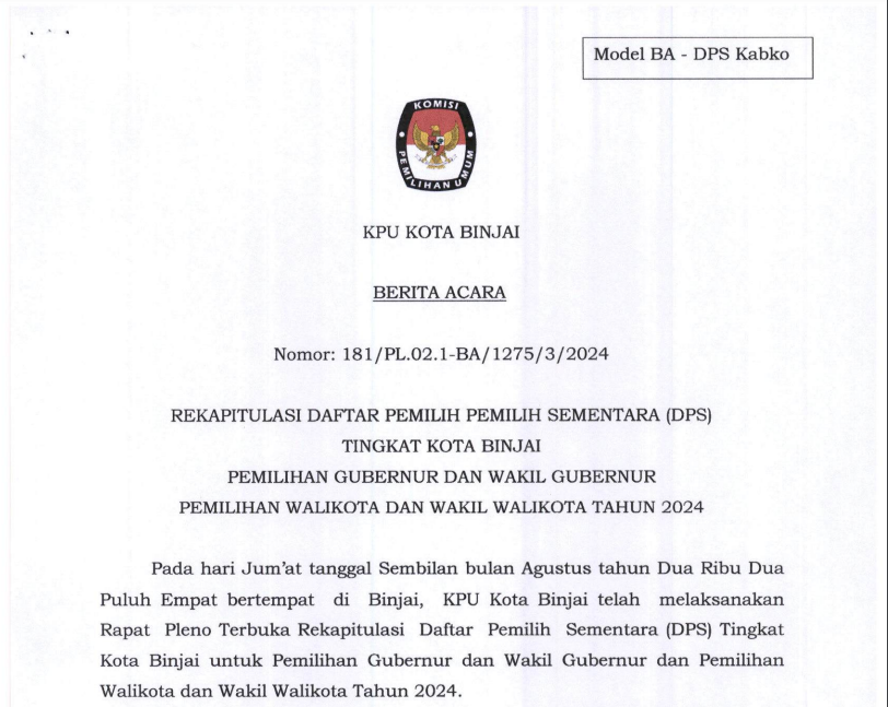 PENGUMUMAN BERITA ACARA NOMOR 181/PL.02.1-BA/1275/3/2024 REKAPITULASI DAFTAR PEMILIH SEMENTARA (DPS) TINGKAT KOTA BINJAI, PEMILIHAN GUBERNUR DAN WAKIL GUBERNUR, WALI KOTA DAN WAKIL WALI KOTA PADA KOTA BINJAI TAHUN 2024.