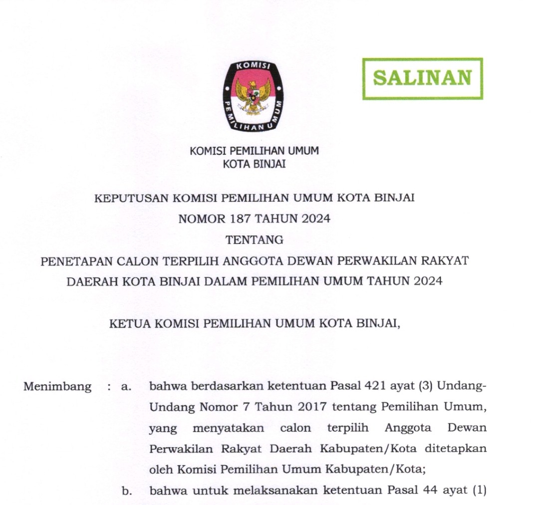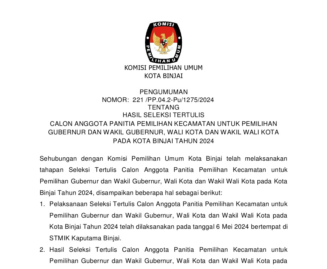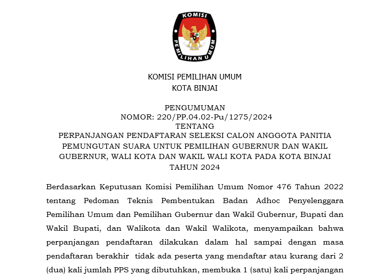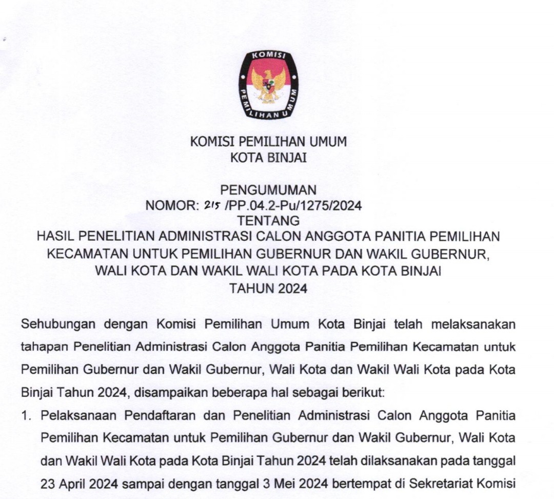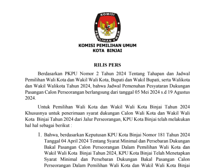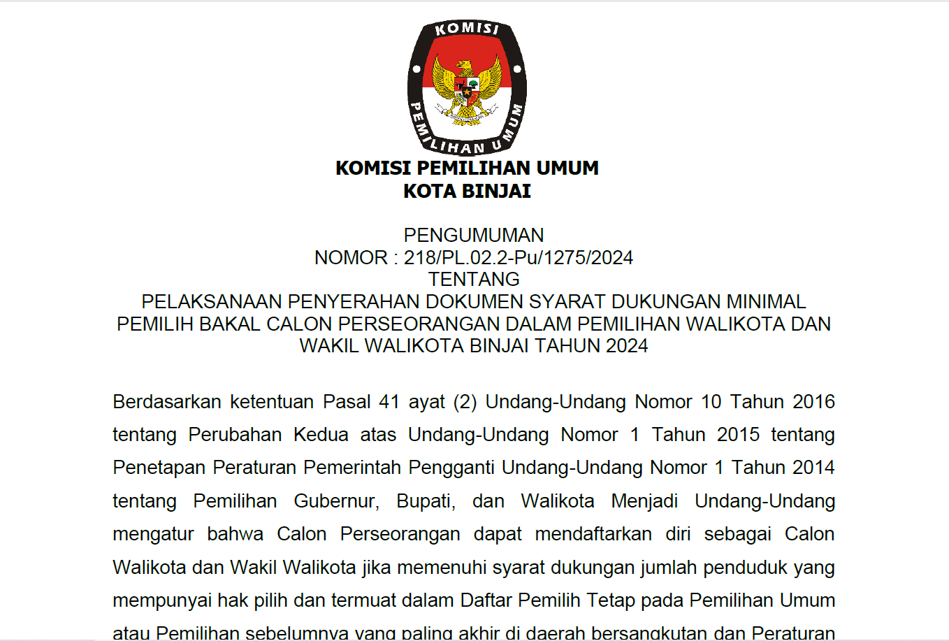 Untuk Pemilihan Wali Kota dan Wakil Wali Kota Binjai Tahun 2024 Khususnya untuk penerimaan syarat dukungan Calon Wali Kota dan Wakil Wali Kota Binjai Tahun 2024 dari Jalur Perseorangan, KPU Kota Binjai telah melakukan hal hal sebagai berikut :